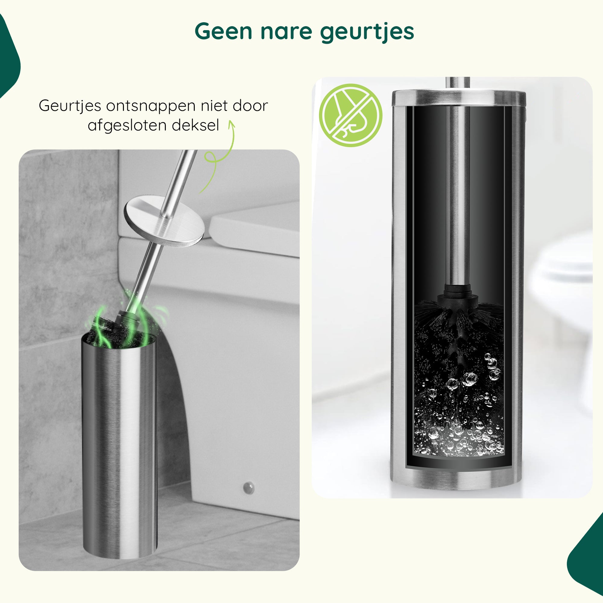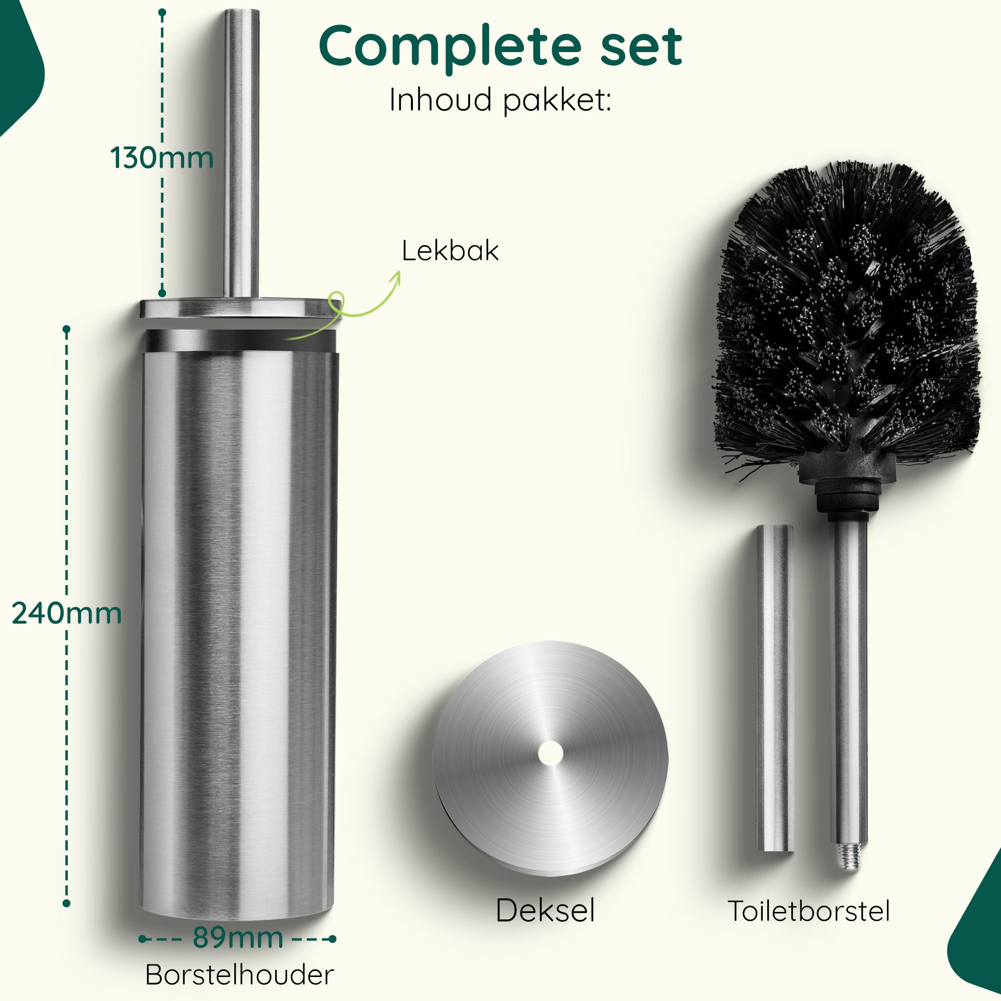 Voordelen: ✓ Complete set: wc borstel, houder en lekbak ✓ Stijlvolle mat zilveren kleur ✓ Vrijstaand design - dus boren niet nodig ✓ Kwalitatief Rvs materiaal