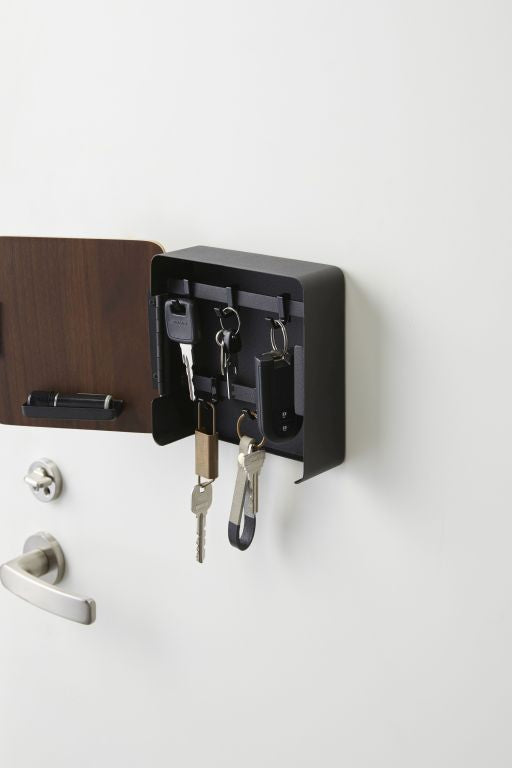Dit functionele magnetische sleutelkastje van Yamazaki kan op metalen oppervlakken en aan een muur worden bevestigd. Het houdt sleutels en andere belangrijke accessoires veilig op zijn plek. De houten afdekking maakt het extra stijlvol. Gemaakt van staal en hout en ontworpen in Japan.