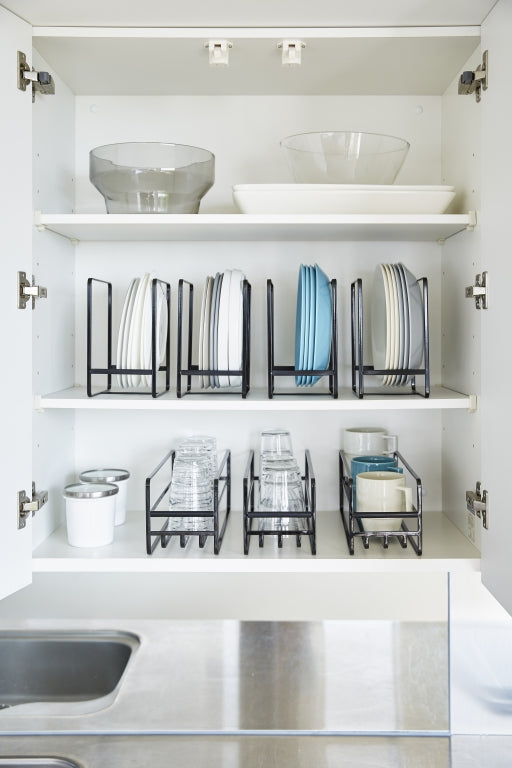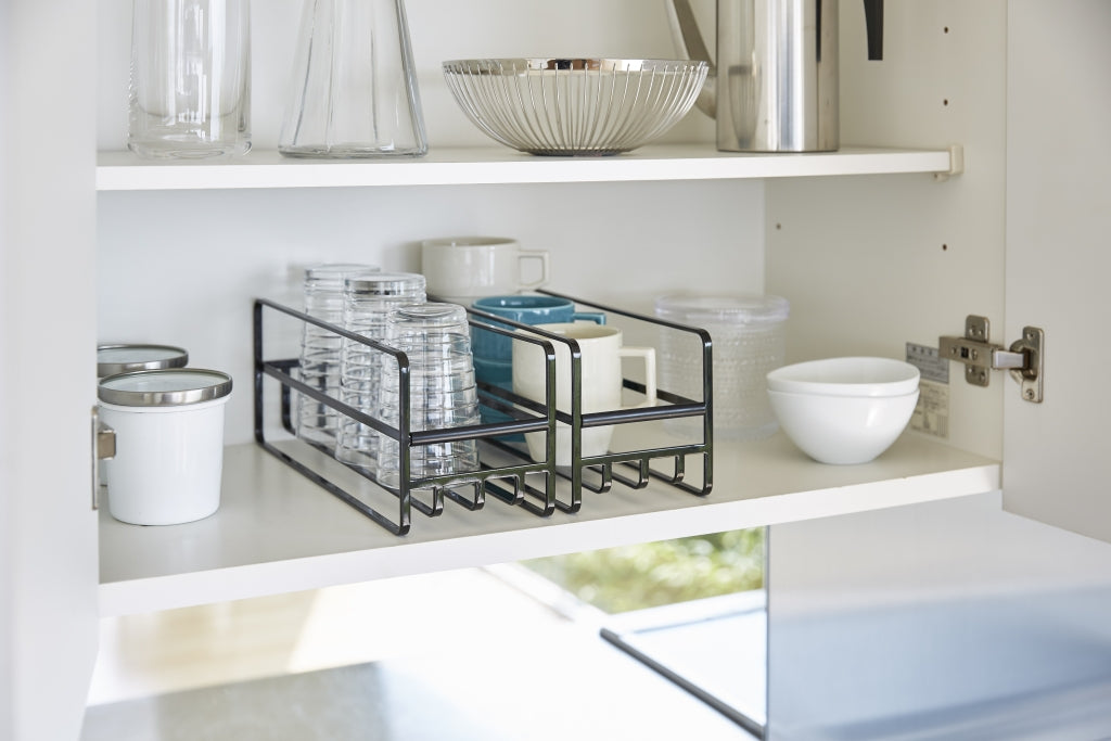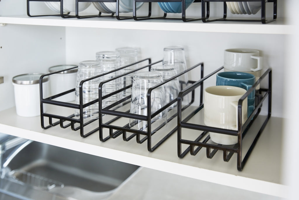 Dit slimme rek van Yamazaki helpt je keukenkastjes georganiseerd te houden en zorgt ervoor dat mokken, flessen en glazen veilig worden opgeborgen.