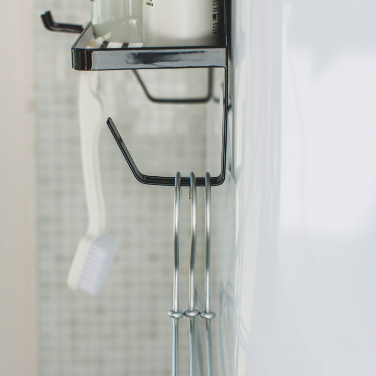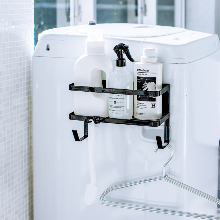 Dit wasrek van Yamazaki is magnetisch en eenvoudig te bevestigen aan een wasmachine of ander metalen oppervlak. Het biedt praktische opbergruimte voor was- of badkamerbenodigdheden op het rooster, dat is uitgerust met twee vaste haken. Daarnaast beschikt het rek over een verplaatsbare haak, ideaal voor het ophangen van kleine gebruiksvoorwerpen die je snel bij de hand wilt hebben.