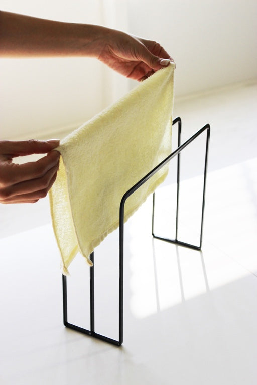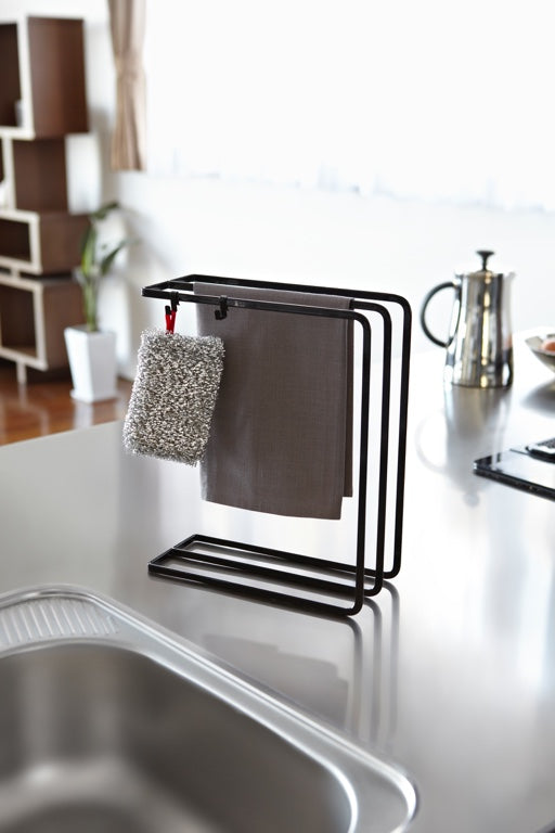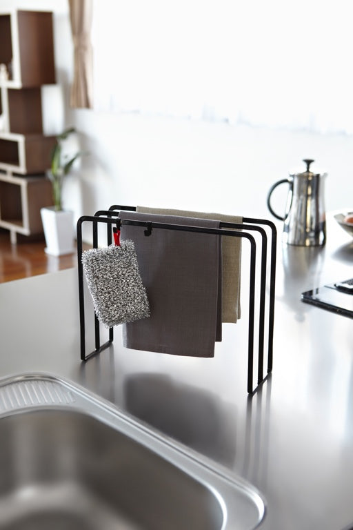De dishcloth hanger van Yamazaki kan zowel verticaal als horizontaal worden gebruikt om vaatdoeken netjes op te hangen.