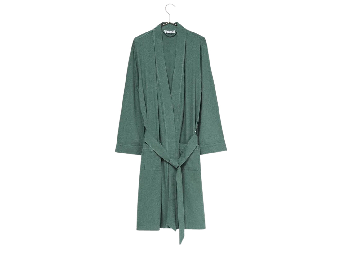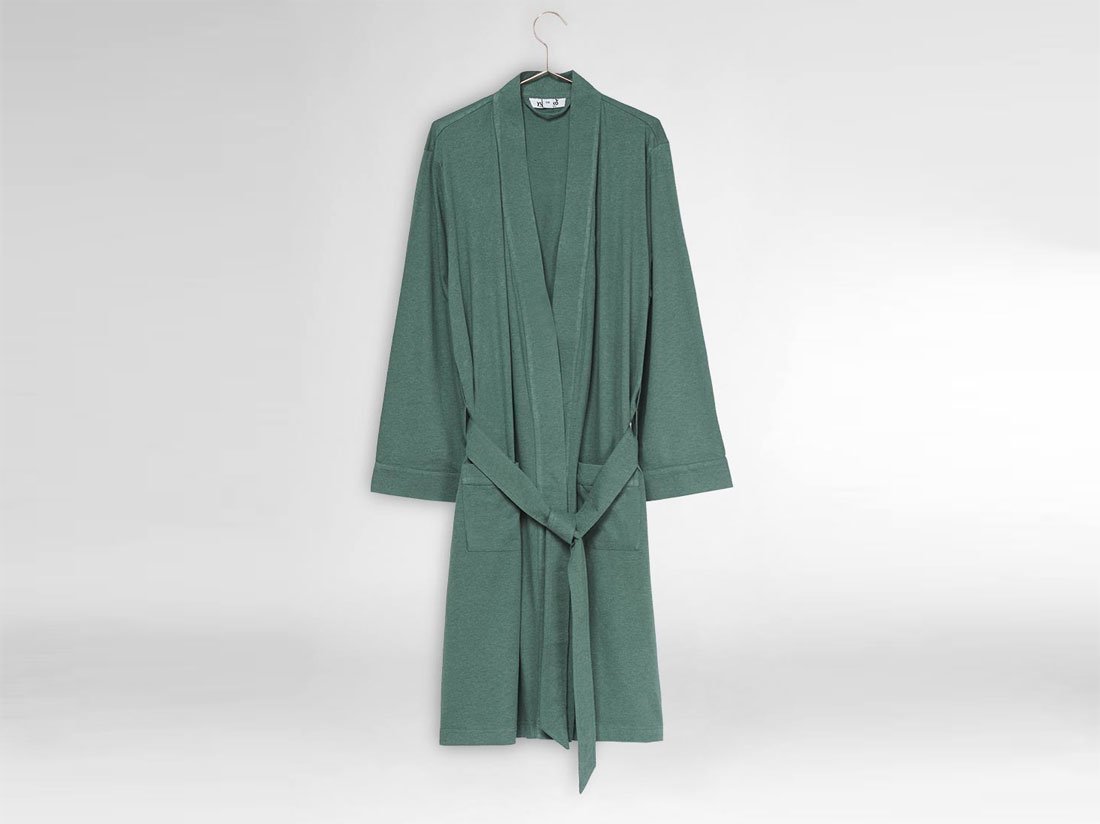 Deze badjas van 100% biologisch en fairtrade jersey katoen is heerlijk zacht, soepel en licht. Alsof u in uw favoriete t-shirt loopt. Maar dan van schouder tot knie. De kleur is Pine green. U schiet 'm zo aan 's ochtends en begint uitermate comfortabel aan een nieuwe (zomer)dag. Doordeweeks of natuurlijk in het weekend.