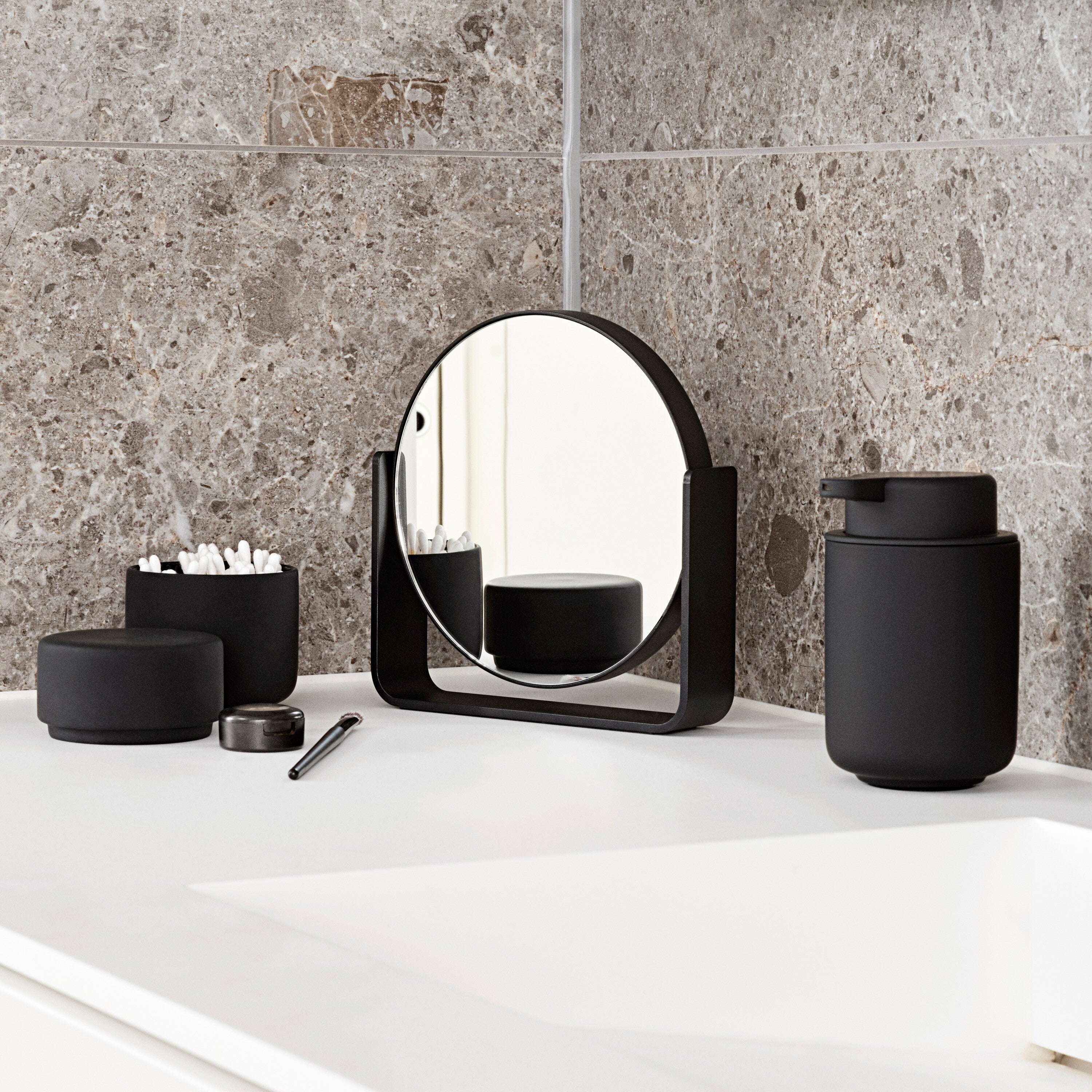 Spot elk detail met de Ume tafelspiegel van Zone Denmark. De normale spiegel of 5x dichterbij, jij kiest. Hij draait makkelijk rond en rust op een breed, stabiel frame. Perfect voor je dagelijkse beauty check of een laatste finishing touch.