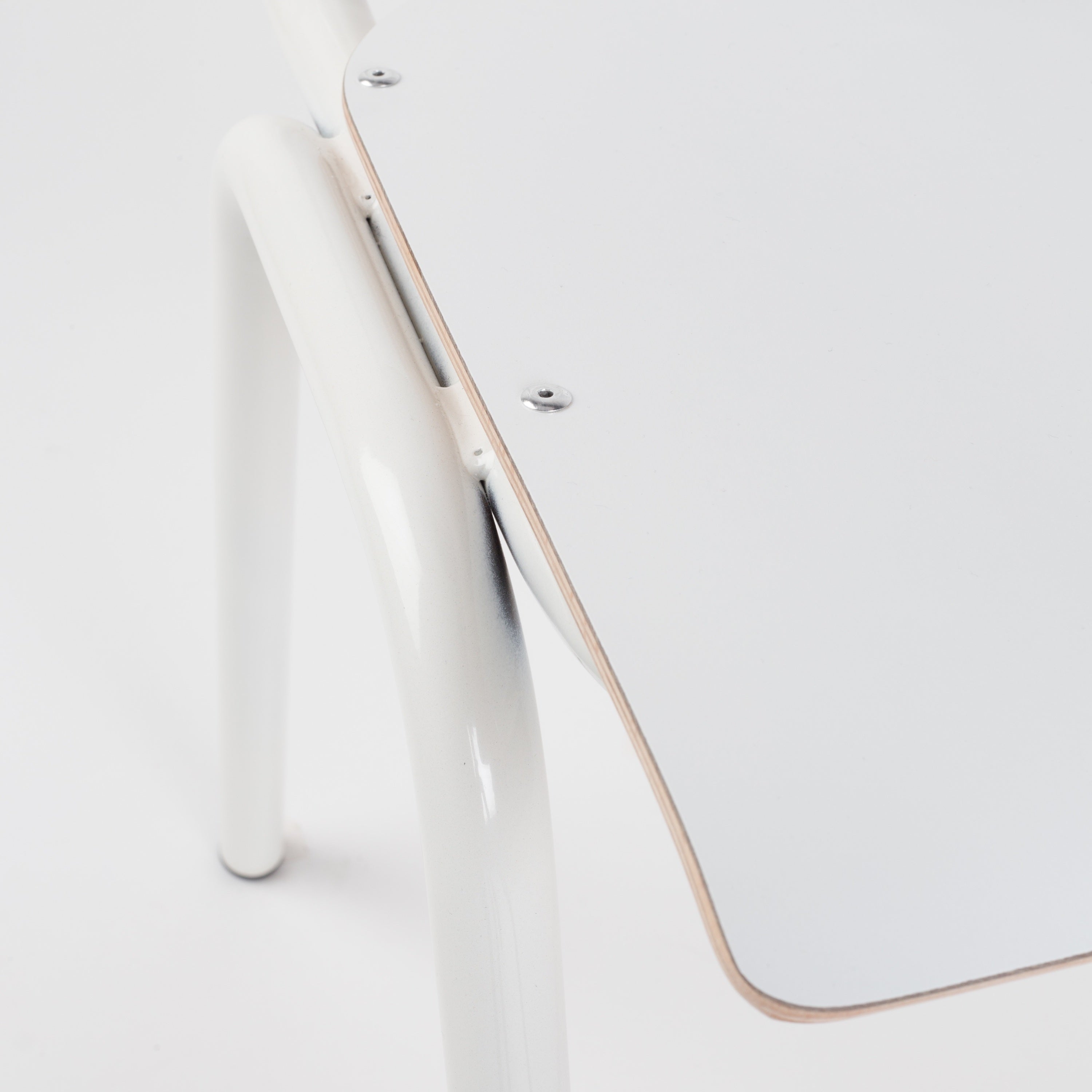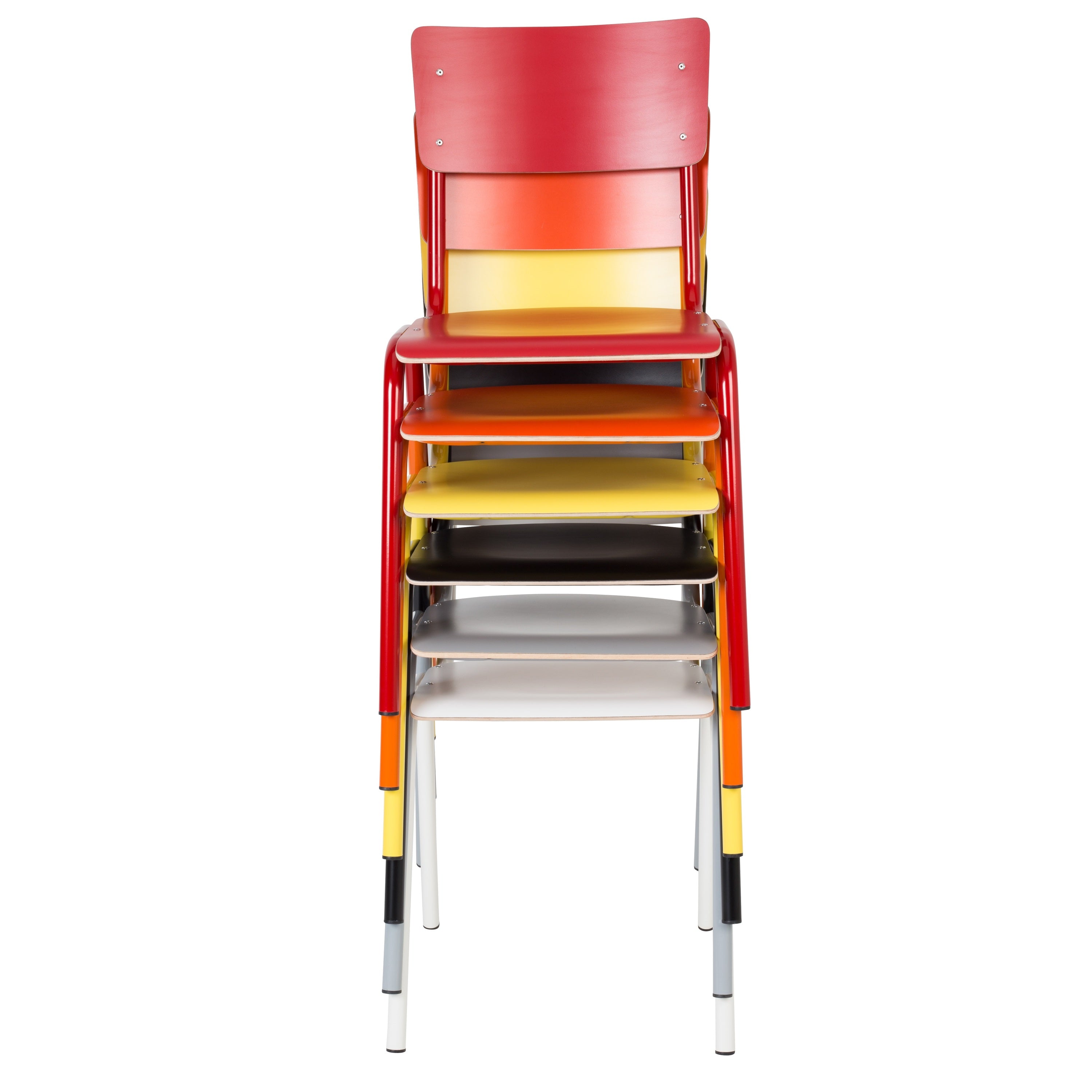 - De houten zitting wordt ondersteund door een metalen onderstel