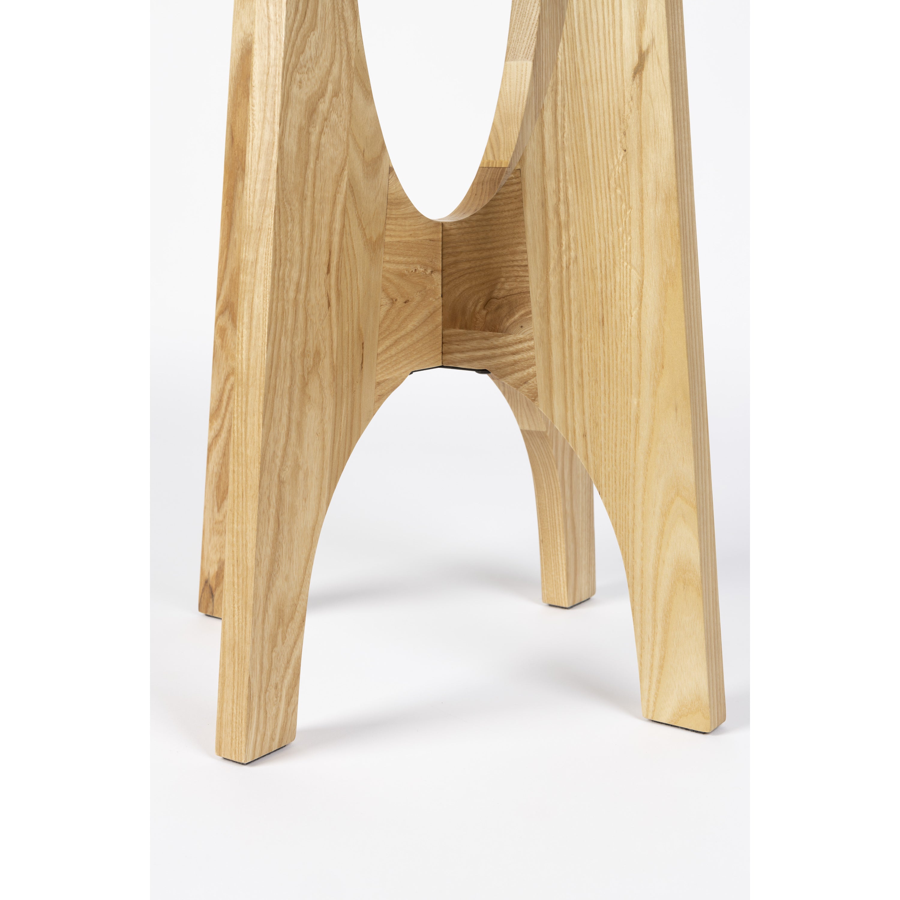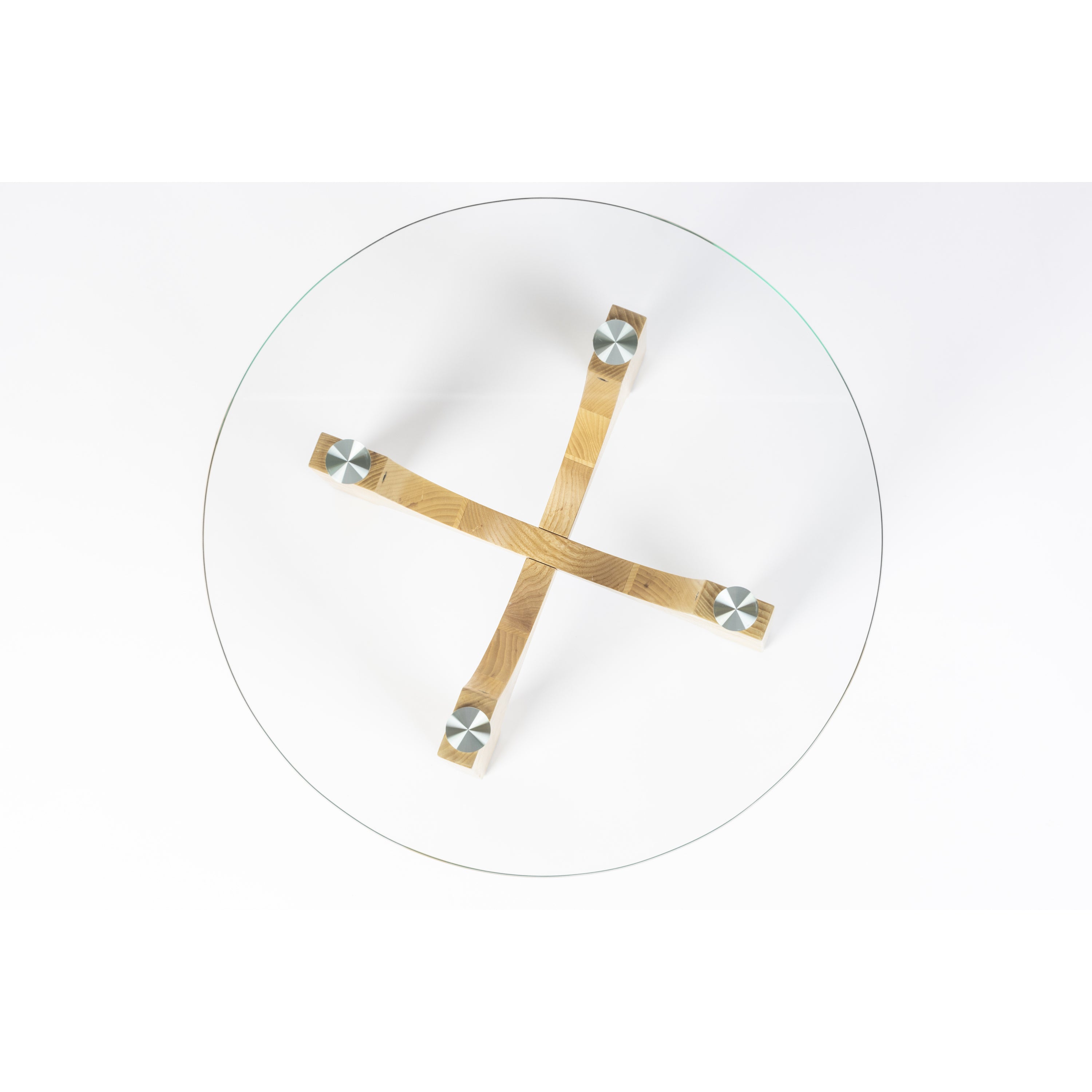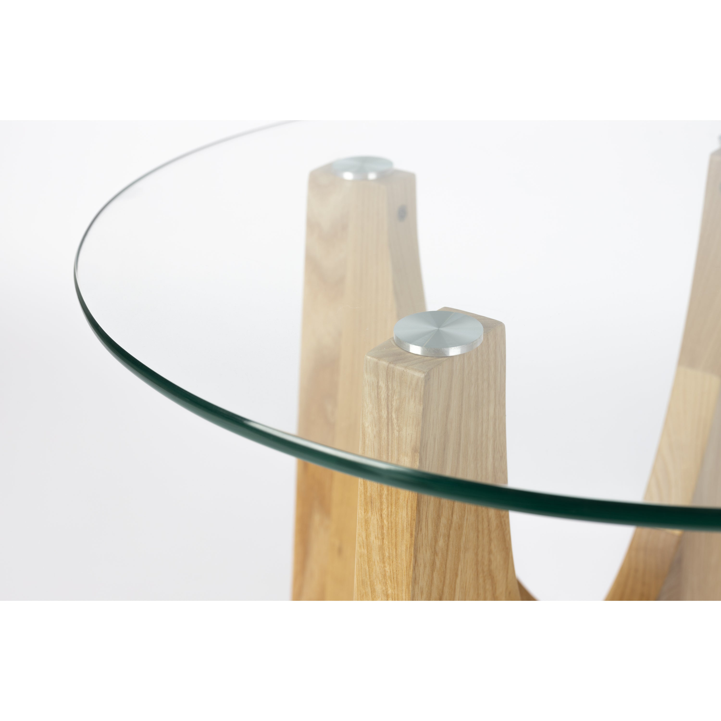 Het essenhouten onderstel, samen met het ronde glazen tafelblad, maakt het ontwerp van deze bijzettafel compleet. Door de combinatie van de pure materialen past de tafel in een rustig interieur.