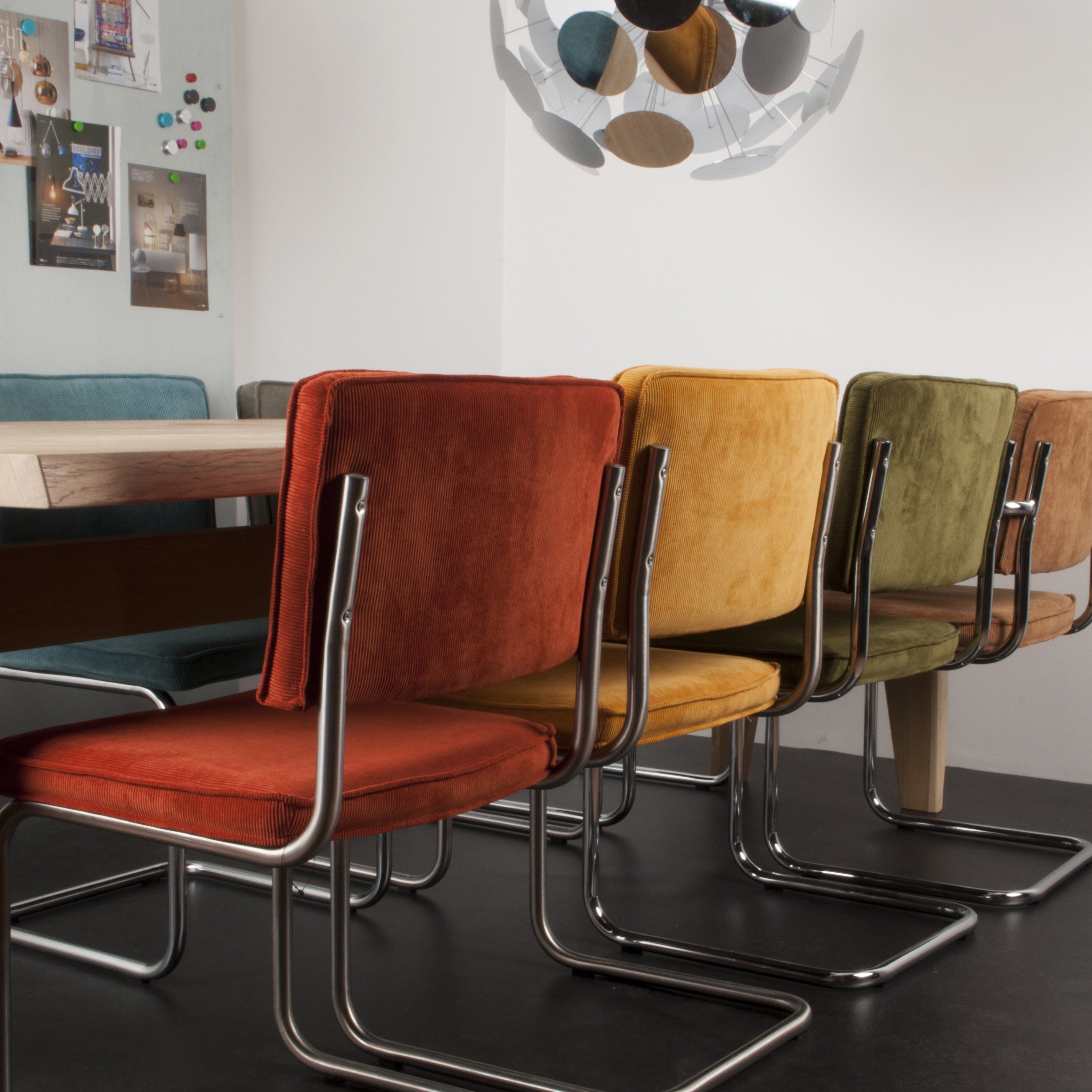 Trendy eetkamerstoel De Ridge Rib stoel van Zuiver past helemaal in de trend van nu, toch heeft deze stoel een tijdloze uitstraling. Dat betekent dat je er nog jaren mee vooruit kunt. De stoere ribstof gecombineerd met het chroombuis design geven de stoel een fraaie uitstraling. Dankzij het slimme buisframe veert de stoel een beetje. Dit maakt de stoelen zeer geschikt voor aan de eettafel. Gezellig, urenlang natafelen!