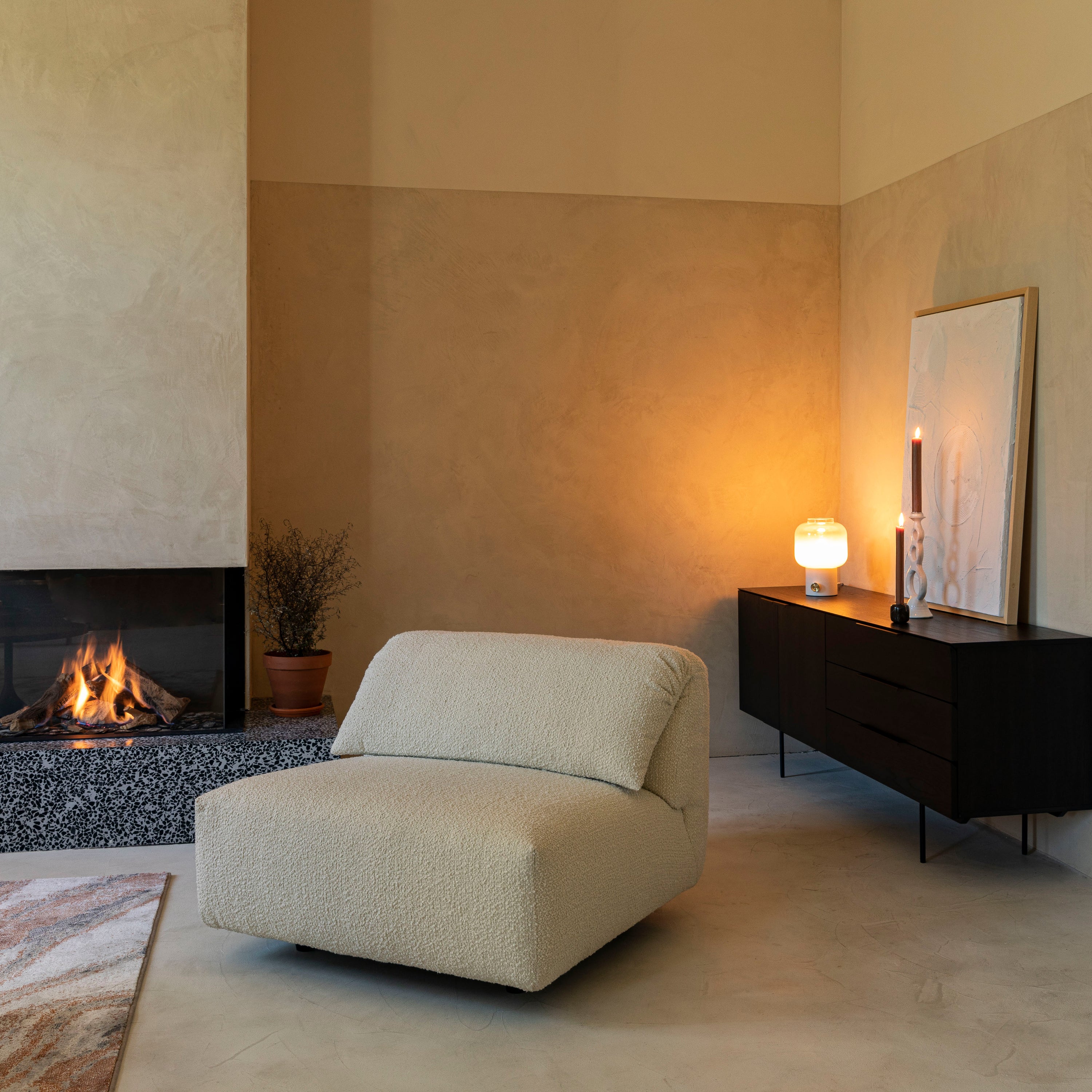 - Hij is bekleed met een bouclé stof, comfortabel en hip!