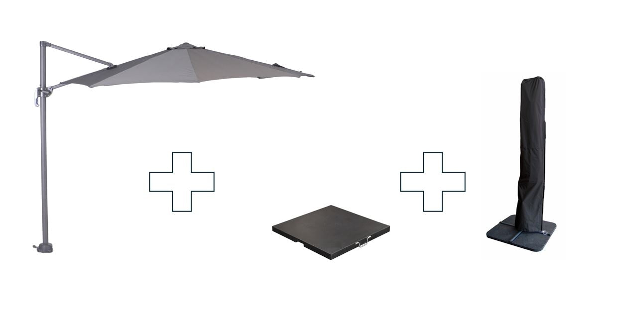 Deze set, bestaande uit de Hawaii S parasol, een 60 kilo zware parasolvoet van cement en een Coverit Hawaii parasolhoes, is de perfecte manier om jouw buitenruimte te voorzien van schaduw, bescherming en stijl.