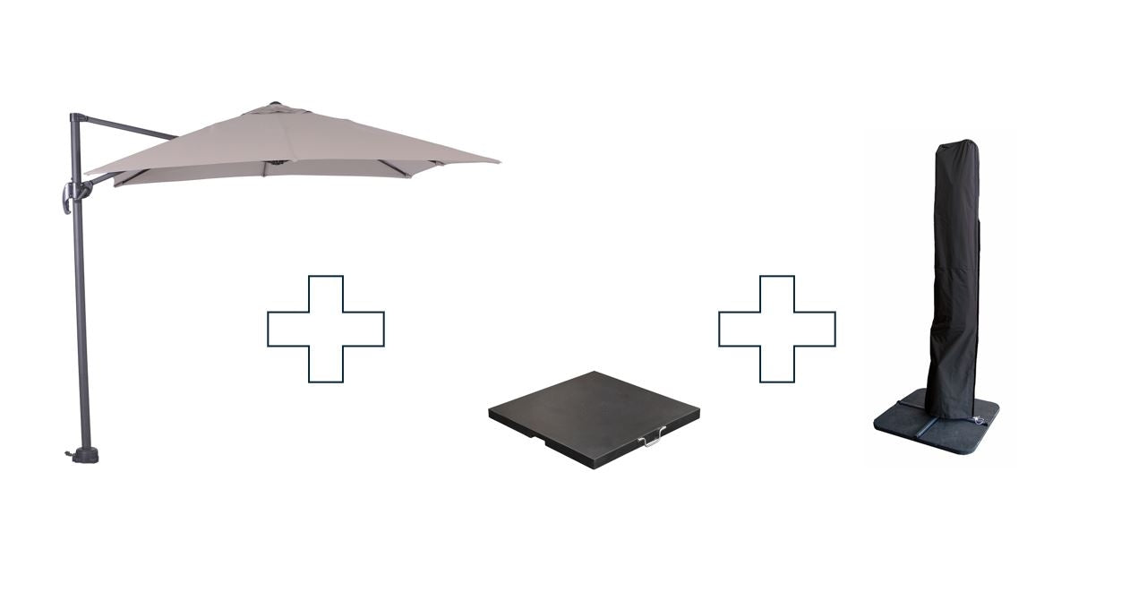 Deze set, bestaande uit de Hawaii S parasol, een 60 kilo zware parasolvoet van cement en een Coverit Hawaii parasolhoes, is de perfecte manier om jouw buitenruimte te voorzien van schaduw, bescherming en stijl.